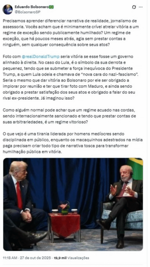 Com frases fortes e postura acusatória, Eduardo Bolsonaro acusou o governo de querer “abarcar o legado” das reuniões e de usar o encontro como “propaganda” para encobrir o que ele chama de “capitulação” brasileira. A movimentação exprime mais que incômodo político: revela sensação de perda de protagonismo entre os setores vassalocratas que apostavam em manter influência junto aos Estados Unidos.