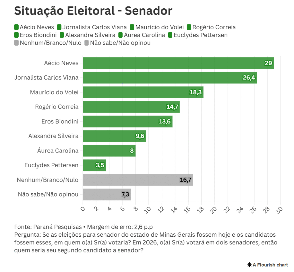 Uma pesquisa do instituto Paraná Pesquisas divulgada esta quarta-feira mostrou que o deputado Aécio Neves (PSDB-MG) e o senador Carlos Viana (Podemos-MG) lideram a corrida pelas duas vagas do Senado em Minas Gerais. O estudo foi realizado entre os dias 1º e 5 de outubro, ouviu 1.505 eleitores em 68 municípios e tem margem de erro de 2,6 pontos percentuais com confiabilidade de 95 %.